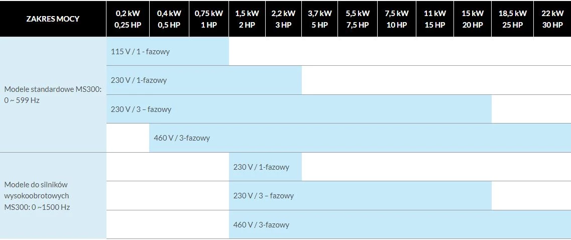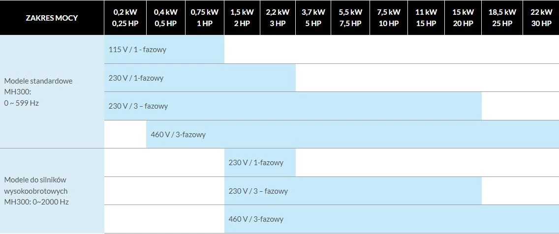 Przemienniki częstotliwości MH300 charakteryzują się kompaktową budową. Nadają się do prostych i bardziej złożonych aplikacji. Posiadają wbudowany sterownik PLC 5k kroków, MODBUS i CANopen, port USB oraz wejście STO. Falowniki te obsługują silniki indukcyjne, a także silniki z magnesami trwałymi. Możliwa jest praca w zamkniętej pętli sterowania. Częstotliwość wyjściowa tych inwerterów wynosi do 2000Hz w otwartej pętli sterowania, natomiast przeciążalność odpowiednio: