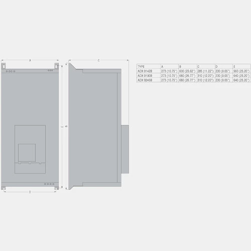 Całościowo sofst starter ADX został zamknięty w obudowie o stopniu ochrony IP20 i wymiarach 680 x 273 x 310 mm.