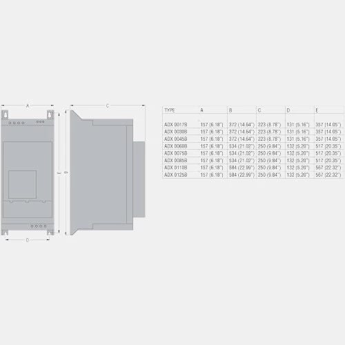 Całościowo sofst starter ADX został zamknięty w obudowie o stopniu ochrony IP20 i wymiarach 373 x 157 x 224 mm.