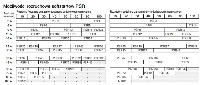 Soft starty ABB z rodziny PSR współpracują z silnikami asynchronicznymi o prądzie od 3A do 105A, i napięciu 208-600 V. Napięcie sterowania urządzeń to 24 V DC albo 230 V AC. Urządzenia przystosowane są do montażu na szynie DIN oraz na płycie montażowej przy pomocy śrub. Kolejna zaletą softstartów ABB PSR jest to, iż posiadają zabudowany stycznik by-pass. Układu łagodnego rozruchu z tej serii współpracują z wyłącznikami silnikami MMS, oraz dysponują przekaźnikiem sygnalizacyjnym RUN.