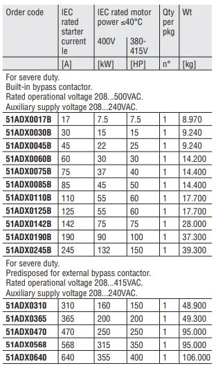 Układy łagodnego rozruchu Lovato Electric 51ADX dostępne są w zakresie mocy od 7,5 kW do 355kW. W standardzie zostały wyposażone w wyświetlacz LCD wraz z przyciskami funkcyjnymi. Wbudowany stycznik bypass posiadają soft startery 51ADX o prądzie znamionowym do 245A. Urządzenie te posiadają sterowanie w 3-fazach. Ponadto dysponują portem szeregowym RS232 oraz RS485. Napięcie pracy dla 51ADX...B wynosi 208...500 VAC, zaś dla modeli 51ADX... jest to 208...415 VAC. Urządzenia dysponują programowalnymi wejściami binarnymi, wyjściem przekaźnikowym, wejściem analogowym prądowo-napięciowym oraz wyjściem analogowym prądowo-napięciowym. Softstarty Lovato 51ADX dodatkowo posiadają programowalne wejście dla drugiego silnika. Dodatkowo softstarty 51ADX Lovato ELectric posiadają takie funkcje jak: