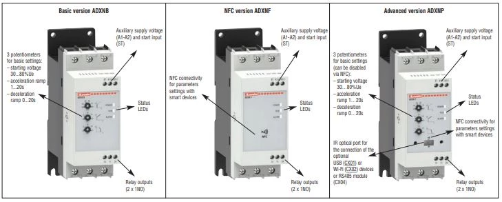 Softstarty ADXNB to wersja podstawowa lub inaczej nazywana bazową. Sprawdza się w aplikacjach wymagających podstawowych funkcjonalności. Konfiguracja od operatora ustawienia zaledwie 3 parametrów: czas rozruchu, czas zatrzymania oraz napięcia początkowego. Regulacja odbywa się przy pomocy 3 potencjometrów umieszczonych na softstarcie.