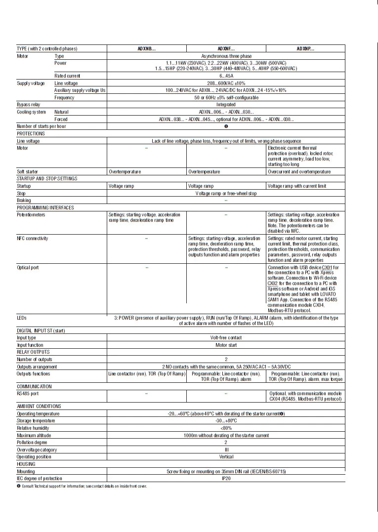 Zaawansowane układy łagodnego rozruchu ADXNP Lovato z elektronicznym zabezpieczeniem termicznym silnika. Podobnie jak ADXNF również posiadają komunikacje NFC oraz dodatkowo potencjometry do ustawień prostych parametrów. Dodatkowo urządzenia z tej serii mogą posiadać opcjonalny moduł komunikacyjny RS485. Ponadto softstarty ADXNP posiadają: regulację ograniczenia prądu, optyczny port do programowania, licznik godzin pracy silnika oraz licznik rozruchów.