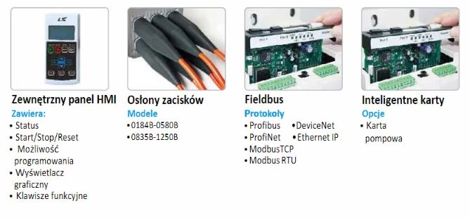 LS oprócz softstarterów oferuje szereg dedykowanych akcesoriów. W ofercie znajdują się: karty komunikacyjne, inteligentna karta pompowa, osłony zacisków czy zewnętrzny panel HMI.