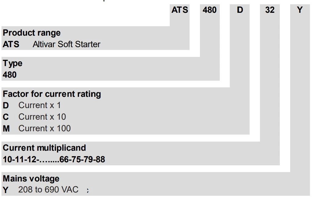 Układy łagodnego rozruchu ATS480 są dostępne w zakresach mocy: od 4 do 900 kW. Zakres napięcia roboczego tych softstartów wynosi 17 do 200A. Urządzenia te pracują przy normalnym i ciężkim obciążeniu. Silniki ATS480 są asynchroniczne w klasach sprawności IE2, IE3, IE4. Sterowanie silnikiem odbywa się za pomocą kontroli momentu obrotowego (TCS) oraz kontroli napięcia. Ograniczenie prądu wynosi 500% prądu znamionowego (do 700% prądu znamionowego silnika). ATS480 mają wbudowany szeregowy Modbus i posiadają protokoły komunikacyjne: Ethernet/IP, Modus TCP, CANopen, RJ45, Profinet, Profibus DP V1.