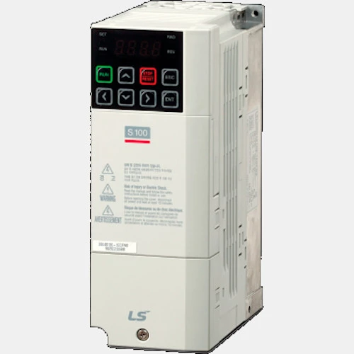 Falownik LSLV0004S100-4EOFNS LG o mocy 0,4/0,75 kW zasilany jest napięciem 3x400 VAC. Przetwornik LSLV0004S100-4EOFNS dedykowany jest do pracy z trójfazowymi silnikami o mocy do 0,4 kW. Prąd wyjściowy tego invertera szacowany jest na poziomie 0,8/1,3A odpowiednio dla pracy lekkiej i ciężkiej, zaś pobór prądu 1,1/2A. Częstotliwość wyjściowa falowników S100 standard LS wynosi odpowiednio 400 Hz przy sterowaniu skalarnym oraz 120 Hz przy wektorowym sterowaniu. 3-fazowy falownik LSLV0004S100-4EOFNS został wyposażony w: 5 wejść binarnych, 2 wyjścia cyfrowe, 2 wejścia analogowe oraz 1 wyjście analogowe. Dodatkowo dysponuje wejściem bezpieczeństwa STO. Komunikacja odbywa się protokołem Modbus RTU po RS485 z możliwością rozbudowy o protokołu Profibus-DP, Profinet, Ethernet/Modbus TCP-IP, CanOpen czy EtherCat. Ponadto trójfazowy falownik S100 LSLV0004S100-4EOFNS posiada wbudowany filtr EMC C3 oraz moduł hamujący, co pozwala na bezpośrednie podłączenie rezystora hamującego. Producent zaleca stosowanie rezystora 1200 Ohm i 100W. LG poleca stosowanie przy falowniku LSLV0004S100-4EOFNS dławika AC indukcyjności 4,81 mH i prądzie 4,8A, dławika DC indukcyjności 16 mH i prądzie 4,27A, stycznika MC-6a 7A. Wektorowy falownik S100 0,5/0,75 HP charakteryzuję się stopniem ochrony IP20, a jego wymiary wynoszą: 180x68x130mm.