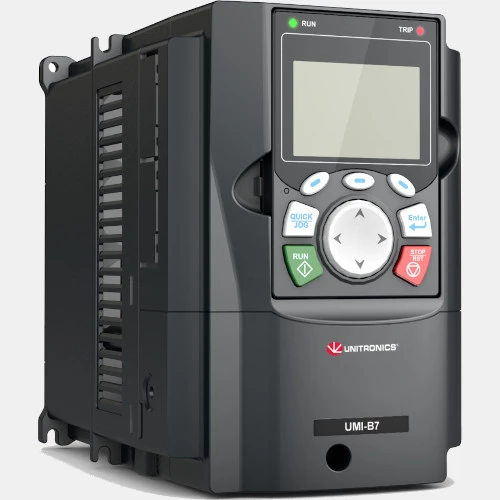 3-fazowy falownik UMI-0040EU-B7 Unitronics o mocy 4 kW przeznaczony do pracy z trójfazowymi silnikami asynchronicznymi oraz synchronicznymi z magnesami trwałymi. Wektorowy falownik Unitronics UMI-B7 UMI-0040EU-B7 zasilany jest napięciem 380...480V AC o częstotliwości 47...63 Hz. Prąd wyjściowy falownika Unitronics UMI-B7 5HP wynosi 9,5 A. Natomiast prąd wejściowy oscyluje wokół 13,5A. Częstotliwość wyjściowa falownika UMI-0040EU-B7 szacowana jest na poziomie 0...400 Hz. Trójfazowy przemiennik częstotliwości Unitronics UMI-0040EU-B7 posiada: 6 wejść cyfrowych, 2 wejścia analogowe, 2 wyjścia przekaźnikowe, 2 wyjście cyfrowe oraz 1 wyjścia analogowe. Ponadto urządzenie to zostało wyposażone w wejście bezpieczeństwa STO SIL2. Przemiennik częstotliwości UMI-0040EU-B7 dysponuje wbudowaną magistralą komunikacyjną Modbus RTU po RS485. Wymiary falownika UMI-B7 UMI-0040EU-B7 to: 256 x 146 x 192 mm.