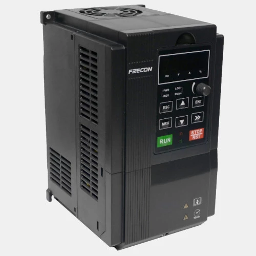 Falownik FR500A-4T-7.5G Frecon o mocy 7,5 kW i napięciu zasilania 3x380VAC. Prąd wejściowy 3-fazowego przetwornika 7,5 kW FR500 wynosi 20,5A, zaś prąd wyjściowy to 17A. Częstotliwość wyjściowa falowników Frecon FR500 wynosi 600Hz. Komunikacja w wektorowym falowniku FR500A-4T-7.5G odbywa się protokołem Modbus RTU po RS485. Trójfazowy falownik FR500 o mocy 7,5 kW został wyposażony w 7 wejść cyfrowych, 2 wejścia analogowe prądowo-napięciowe, 1 wejście analogowe napięciowe, 2 wyjścia tranzystorowe, 2 wyjścia przekaźnikowe oraz 2 wyjścia analogowe prądowo-napięciowe. Producent zaleca stosowanie w falowniku FR500A-4T-7.5G rezystora hamowania o mocy 800W i rezystancji 75 Ohm. Frecon deklaruje możliwość pracy inverterów FR500 w zakresie temperatur od -10 do +40 stopni Celsjusza. Kompaktowa obudowa falownika FR500A-4T-7.5G charakteryzuje się IP20 raz wymiarami: 186,6x116,6x175. Waga falownika wynosi 2,5 kg.