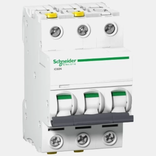 Wyłącznik nadprądowy Acti9 iC60N-C3-3 rozwierne bieguny 3P o charakterystyce C. Maksymalny prąd znamionowy wynosi 3 A dla prądu przemiennego AC, natomiast napięcie udarowe 6 kV. Zabezpieczenie nadmiarowo-prądowe A9F04303 wyposażone zostało w termomagnetyczny wyzwalacz o górnej granicy aktywacji 8 x In +/- 20 % o zdolności wyłączania 6000 A Icn w 400V AC i 10 kA Icu w <= 180 VDC. Wyłącznik nadprądowy Schneider Electric jest w stanie pracować w zakresie temperatur: -35...70°C. Urządzenie posiada obudowę z tworzywa przystosowaną do montażu na szynie DIN. Wymiary nadprądówki A9F04303 to: 54mm x 91mm x 78,5mm, zaś waga wynosi 375gram. Producent podaje trwałość mechaniczną na 20 000 cykli, a trwałość elektryczną na poziomie 10000 cykli. A9F04303 wyposażony został w przyłącza w formie zacisków podwójnych .